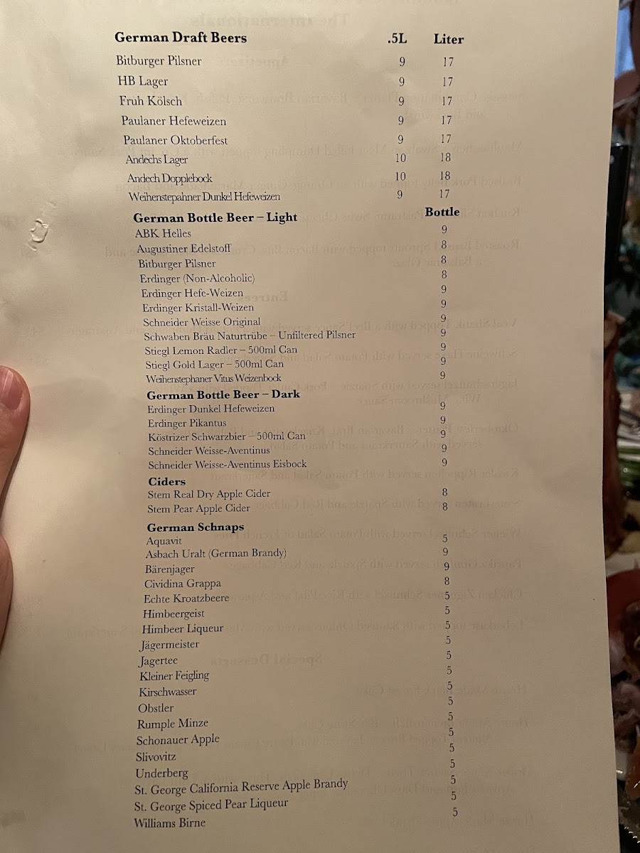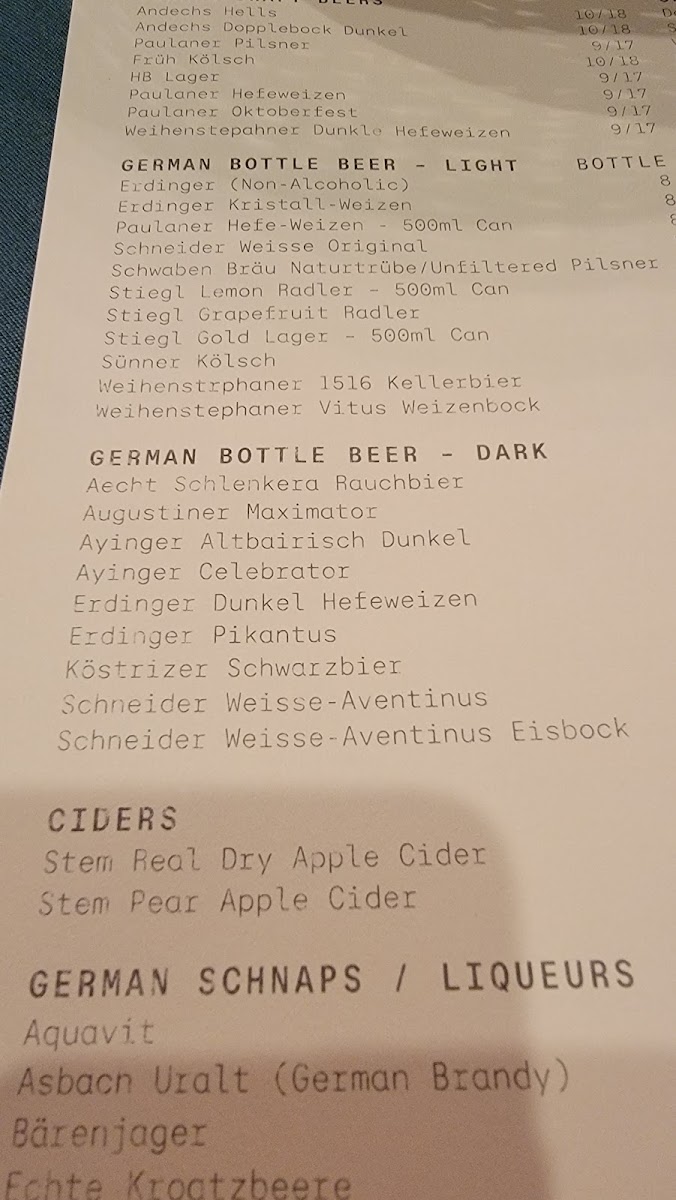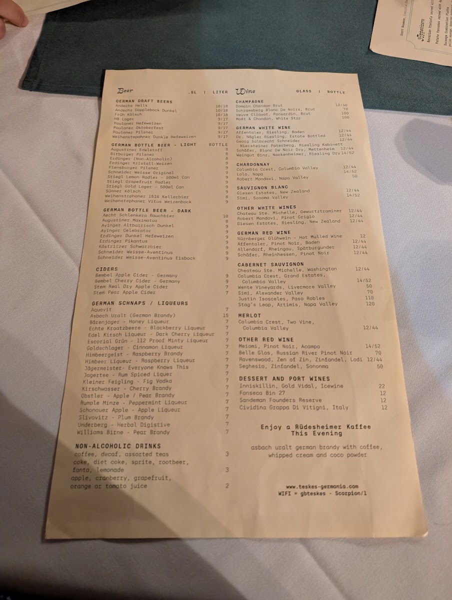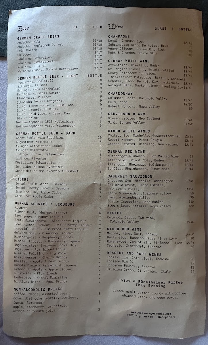 And let’s not forget the drinks! Teske’s offers a fine array of non-alcoholic beverages, from rich, aromatic coffee at just $3 to refreshing Pellegrino mineral water for $5. For wine lovers, their selection includes the delightful Giesen Sauvignon Blanc from New Zealand and the warming Nürnberger Glühwein – perfect for a lively evening with friends. The bar is well-stocked with a fantastic range of German beers, celebrated for their quality and variety, both on tap and in bottles, creating an energetic and friendly atmosphere that is hard to beat.